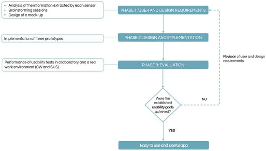 Phase 1, carried out after understanding and specifying the context of use, was initiated by identifying the equipment needed and understanding the information provided by each sensor. Then, it allowed the design of a mock-up resulting from a brainstorming session between the research team members. This design solution was then presented to the subset group of potential users, and a brainstorming session with the therapists was performed. Through this exchange of ideas, the needs of the occupational therapists were identified, and the app requirements were specified. The following phases—phases 2 and 3—consisted of the implementation and consecutive evaluation of the design solution (i.e., a prototype). The evaluation of each prototype was based on the application of usability evaluation methods, which made it possible to ascertain whether the prototype developed corresponded to the usability objectives outlined for the app. In each iteration, the research team analysed and discussed the results obtained, and improvement proposals were identified to be implemented in the following iteration.