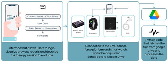The Android mobile application establishes a connection with the web server via a JavaScript-designed interface. On the mobile phone, wearable sensors link to the application via Bluetooth, facilitating the data acquisition session. The acquired data is stored locally on the mobile phone as a .txt file and is concurrently uploaded to a designated Google Drive folder. Python code (version 3.10) is then employed to analyse the data, generating a conclusive report that is subsequently uploaded within the application.