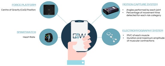 Representation of the parameters included in E4W (The image of each sensor was taken directly from the supplier’s website: Motion Capture System—www.teaergo.com/captiv/, Electromyography System and Force Platform—www.pluxbiosignals.com/, Smartwatch—www.oppo.com/pt/accessories/watch/, accessed on 15 May 2025).