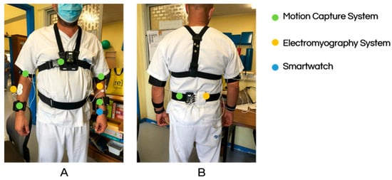Demonstration of the sensors’ placement on an occupational therapist (A) Anterior side of an occupational therapist with the motion capture sensors and the electromyography system; (B) Posterior side of the occupational therapist with both motion capture and surface electromyography sensors.