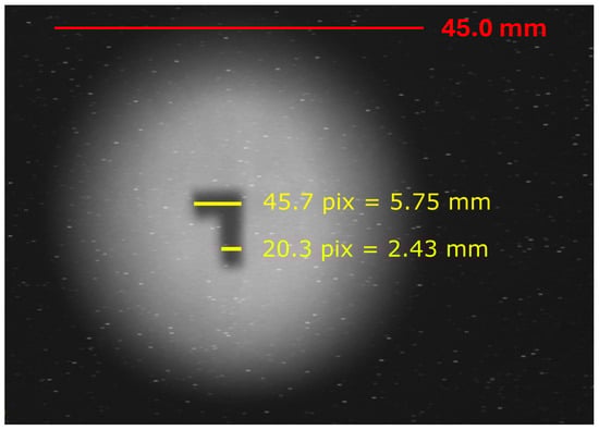 VESUVIO beam profile at thermal energies, obtained via a CCD camera and a neutron-absorbing converter material. The L-shaped darker region at the center of the beam corresponds to the cadmium foil used to calibrate the beam size, with the conversion parameter indicated by the yellow lines. A red bar corresponding to 4.5 cm is given as the size of the beam penumbra. Figure from the instrument internal calibration (2016).