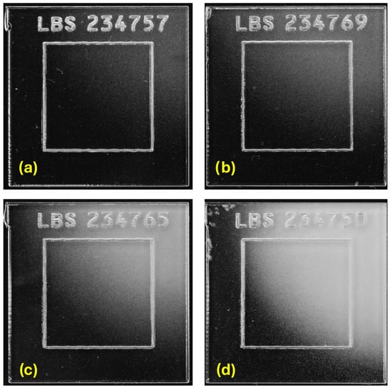 After irradiation, all the dosimeters underwent the etching process, in order to develop visible tracks. The procedure consisted in a pre-etching phase for 30 min at a temperature of 70 °C in a solution of 60% NaOH (6.25 N) and 40% ethanol. In a second phase, the etching was performed over a period of 70 min at a temperature of 97 °C in a NaOH solution (6.25 N).The dosimeters also showed, macroscopically, partial saturation with the longer irradiation times in the spatial region where the neutron beam center was expected. This enabled performing a simple inspection of the neutron beam shape, particularly for the dosimeters irradiated for 30 and 60 min, as shown in Figure 2.