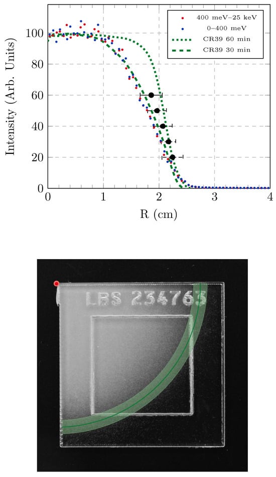 (Top) The intensity profile for the VESUVIO spectrometer obtained by analyzing CR-39 dosimeters was compared to experimental and literature intensity profiles reported in [,]. The dashed and dotted curves represent the intensity profile of two CR-39 dosimeters, irradiated for 30 and 60 min, respectively. All the curves are normalized to a maximum intensity of 100. It is possible to see the effect of saturation on the shape of the curve. The black dots and their error bars represent the mean and standard deviation obtained by analyzing the irradiated dosimeters with the Hough circle transform, at different attenuation percentages. (Bottom) An example of the analysis based on the Hough circle transform, showing an arc of a circle corresponding to a radius of 2.17 ± 0.13 cm obtained with a threshold of 70% attenuation, superimposed on an optical image of one of the dosimeters irradiated on VESUVIO.