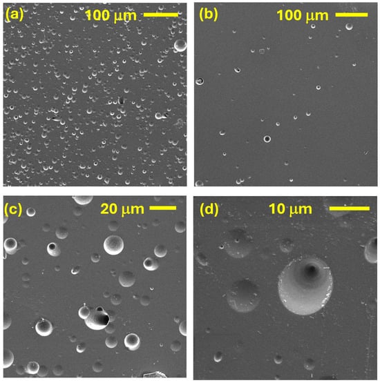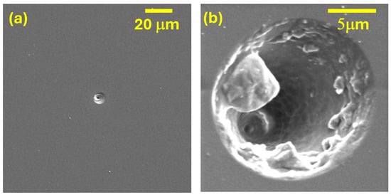 As mentioned, the irradiation of the CR-39 dosimeters on VESUVIO, and the subsequent etching procedure, lead to track saturation, especially at the center of the neutron beam. As this prevented us from analyzing the larger tracks through optical microscopy, SEM characterizations of the samples were performed, both in the case of dosimeters irradiated on NILE (e.g., those in Figure 5) and on VESUVIO (e.g., those in Figure 6).