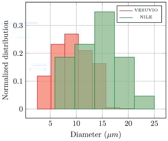 The distribution of the fitted values of the track diameters as obtained from the SEM images of neutron-irradiated dosimeters at the VESUVIO and NILE beamlines. Due to limited available data, the NILE track distribution histogram was constructed with only 5 bins, in contrast to the 7 bins used for VESUVIO.