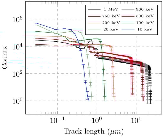 To quantify the track formation length, before etching, we performed Monte Carlo transport simulations using the Geant4 toolkit, version 10.7.4., employing the physics list QGSP_BIC_HP. This is a reference physics list available inside the toolkit, which combines the models of the QGSP_BIC reference physics list, used for the simulation of precise hadronic interaction, with the models for “high precision” (HP) neutron interaction, which take into account neutrons with energies below 20 MeV [,]. Targets with the same physical dimensions of the actual CR-39 dosimeters were placed in a vacuum and irradiated with a monochromatic neutron beam perpendicular to the flat dosimeter face, covering its entire area and neglecting any beam divergence. Therefore, at the detector position, the beam area has the same dimensions as the dosimeter itself. The PADC material was implemented as a custom-defined Geant4 material, with stoichiometry C12H18O7 and density 1.15 g/cm3. A series of simulations were carried out for different energies of the primary monochromatic neutrons (10, 20, 50, 100, 200, 350, 435, 500, 750, and 900 keV; as well as 1, 1.2, 3, 5, 10, 14.1, 50, and 100 MeV). Scoring was implemented through a custom Geant4 sensitive detector and hit classes, which recorded the secondary particle type, as well as its energy deposition and step length for each step inside the detector, accumulating these values to obtain the total deposited energy and track length. These secondary particles are the natural isotopes of hydrogen, oxygen, and carbon that are present inside the CR-39 material, which travel inside the dosimeter after neutrons induce their recoil. At MeV energies, secondary particles could also include products of inelastic nuclear reactions on the sample isotopes.
