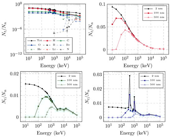 (Top left) The total number of tracks (longer than 2 nm) per incident neutron of a given incident energy (black dots), as well as the individual contribution from all secondary nuclei detected. The other panels report the number of tracks longer than 1 nm, 100 nm and 500 nm, generated by hydrogen (top right), carbon (bottom left), and oxygen nuclei (bottom right). It is interesting to note that the peaks in the latter plot appeared at energies that correspond to elastic resonances in the neutron cross-section of oxygen.