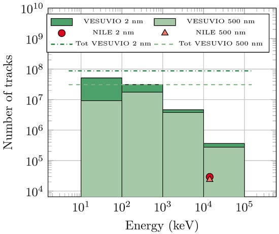 Number of tracks expected from simulations after a 5 min VESUVIO irradiation from several neutron energy intervals (histogram), as well as the total (dashed line), with track length thresholds at 2 nm and 500 nm. The number of tracks after 2 min irradiation on NILE is also reported as markers.