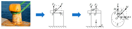 Taking into account the actual situation, precise determination of the force point on the edge of the bollard is challenging because the direction of the cable changes with the movement of the ship. Consequently, the force point is shifted from S to the axial center O of the bollard. For the axial force Fa, a force couple M = Fa × R is introduced at O via the parallel axis theorem. The radial force Fr is directly shifted to point O under the assumption of negligible bollard section deflection. The resultant force F and couple M at O are resolved into Cartesian components Fx, Fy, Fz, Mx, and My, as illustrated in Figure 1. Let ɸ denote the angle between Fa and the positive Z-axis and θ represent the angle between Fr and the positive Y-axis (clockwise positive). The following relationships hold: