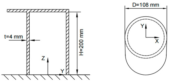 The bollard features a nominal diameter of 108 mm, wall thickness of 4 mm, height of 200 mm, and a unilateral cap extension with one side of the bollard cap extending outward. The bollard is constructed from steel with a Young’s modulus of 206 GPa and Poisson’s ratio of 0.3.