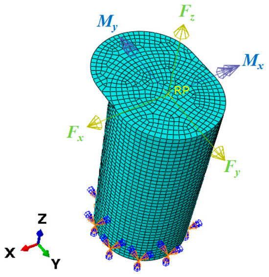 Furthermore, the base of the mooring bollard is constrained by fully fixed boundary conditions. The force and moment act at the axial center of the bollard top. To achieve realistic strain distributions under axial bending moments, a rigid coupling constraint is implemented between the top axial center point and the perimeter of the bollard’s circular cross-section. The cylindrical portion of the model, excluding the bollard cap, is divided into 2400 elements, with meshing performed using four-node thin shell elements for meshing (chosen for computational efficiency given the structure’s thin-walled nature). The finite element model is illustrated in Figure 3.