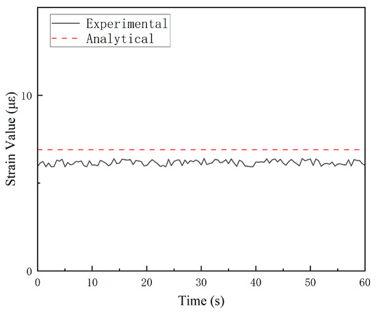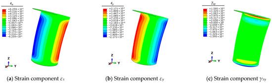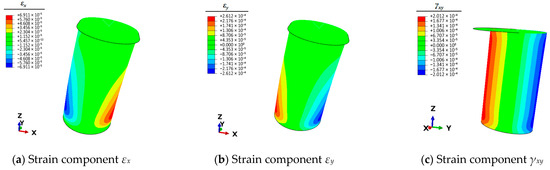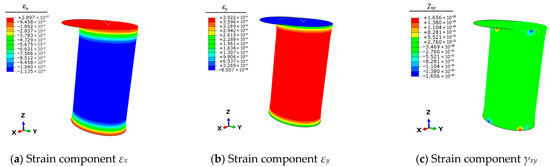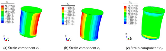 As evident from the results presented in Table 3, although the error variations at individual measurement points differ after the finite element (FE) model updating, the reduction in the objective function value indicates a decrease in the overall error between the FE calculations and experimental results. Consequently, utilizing the FE model with parameters D = 108.0 mm and t = 4.10 mm, unit loads are applied following the methodology outlined in Section 3.2 to obtain the full-field strain response of the bollard after model updating.