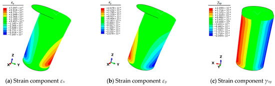 Therefore, it is necessary to use the finite element simulation technique to calculate the full-field strain information of the mooring bollard under the five unit load conditions. This strain information can be articulated by the three planar strain components εx, εy, and γxy of the shell elements. The strain results of each condition are shown in Figure 4, Figure 5, Figure 6, Figure 7 and Figure 8.
