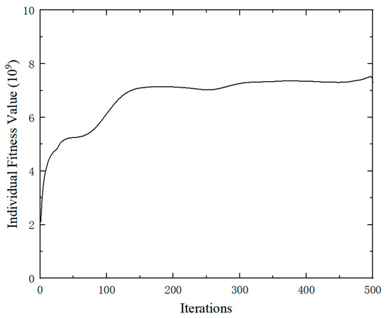 Candidate regions were defined by excluding areas within 30 mm of the fixed boundary and 75 mm of the top load application zone. Based on the strain values of these candidate regional units, an initial population is created and iteratively computed through genetic operators. Figure 9 shows the variation curve of fitness values. As can be seen from the figure, the fitness value tends to stabilize after 150 iterations.