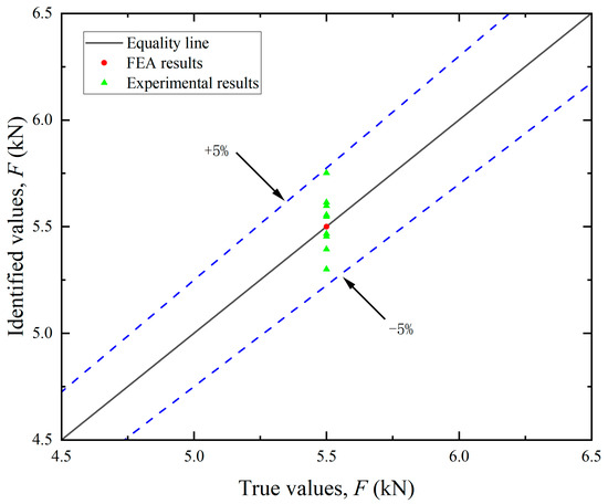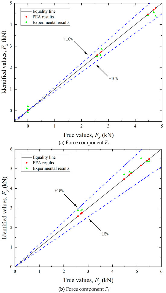 By utilizing the aforementioned experimental methodologies, the measured surface strain of the test bollard was obtained under various tension conditions listed in Table 2. Directional load components were computed using Equation (13), with the experimental results for load magnitudes and angular orientations detailed in Figure 11 and Figure 13, respectively. The final identification results of the mooring cable load were calculated using Equation (18) and presented in Figure 12. In these figures, load identification values from finite element simulation and experiment are presented as two sets of scatter points, with their corresponding deviations from the equality lines indicated by dashed error bars.