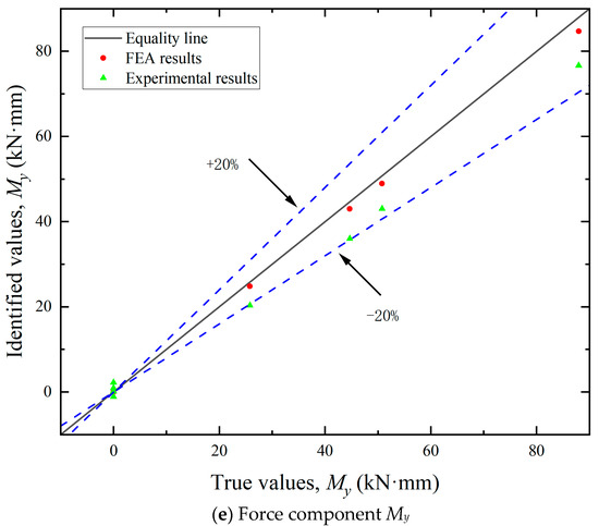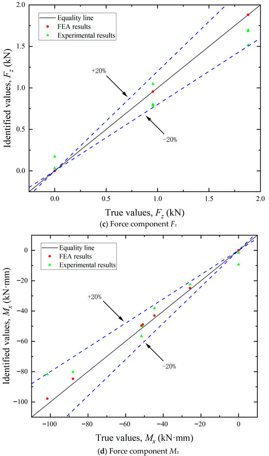 (1) Identification of load components. As shown in Figure 11, the maximum errors associated with the five load components varied. The identification accuracy for the horizontal loads (Fx and Fy) was higher than that for the vertical load (Fz) and the bending moments (Mx and My). These discrepancies can be primarily attributed to differences in load application methods. In the finite element analysis, forces and equivalent moments were idealized as applied at the axial center of the bollard. During practical experiments, however, the load was introduced eccentrically at the edge, leading to variations in structural strain responses. Since the horizontal load components act through the top center, the strain response differences between the two loading modes are relatively small. In contrast, vertical loads and the moments induced by them elicit more pronounced changes in strain response. Since the location and direction of the mooring cable load are unknown prior to identification, the unit load in FEA can only be applied using the center loading method when constructing the influence coefficient matrix. Experimentally, however, structural strains were measured under edge-loading conditions. This inconsistency in loading configuration contributes to the observed identification errors.