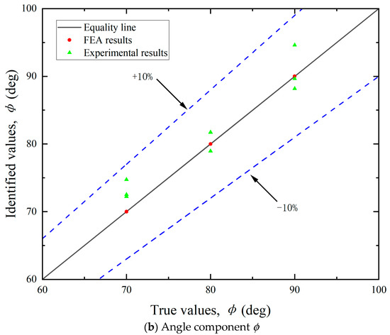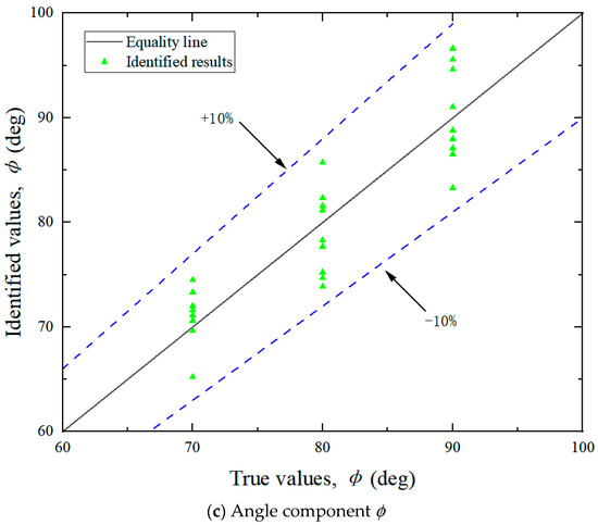 (2) Identification of load direction. As illustrated in Figure 12, the identification errors for both the horizontal angle (θ) and vertical angle (ɸ) were within ±10%. The errors did not exhibit a consistent trend and were largely stochastic across the tested cases. This randomness may be attributed to the two main causes: deviations in load direction and measurement inaccuracies in the strain gauges. Although the tension meter accurately controlled the magnitude of the cable load during testing, the direction was not mechanically regulated and relied on manual alignment, introducing directional deviation. Consequently, the identified load direction and its components also deviate from the required values. The angular setting errors can be significantly reduced through automatic alignment systems. Additionally, strain gauges inherently possess measurement errors. Positioning strain gauges accurately on a cylindrical bollard was challenging, often resulting in misalignment between the actual position and the intended measurement points. Despite implementing finite element updating to mitigate these errors, complete elimination was not feasible.