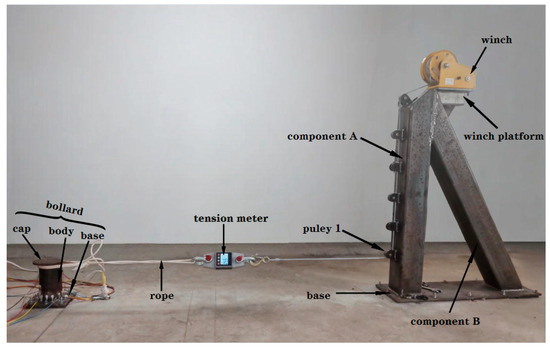 To validate the applicability of the proposed method in measuring the mooring cable load in the scenario depicted in Figure 1, a bespoke bollard and a customized tension-providing frame were designed and constructed.