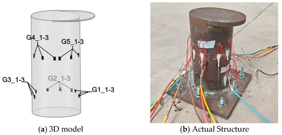 Following the aforementioned procedure, the finalized strain gauge configuration (Figure 10) positions gauges G1–G3 at 37.5 mm above the bollard base and G4–G5 at 122.5 mm. The orientations of the five strain gauges are all close to 90°; that is, along the axis of the bollard. Referring to the strain contour plots of the finite element results, it can be observed that all measuring points are situated within strain-sensitive areas. Subsequently, the influence coefficient matrix can be derived using the FEA strain results of these five locations under each unit load.