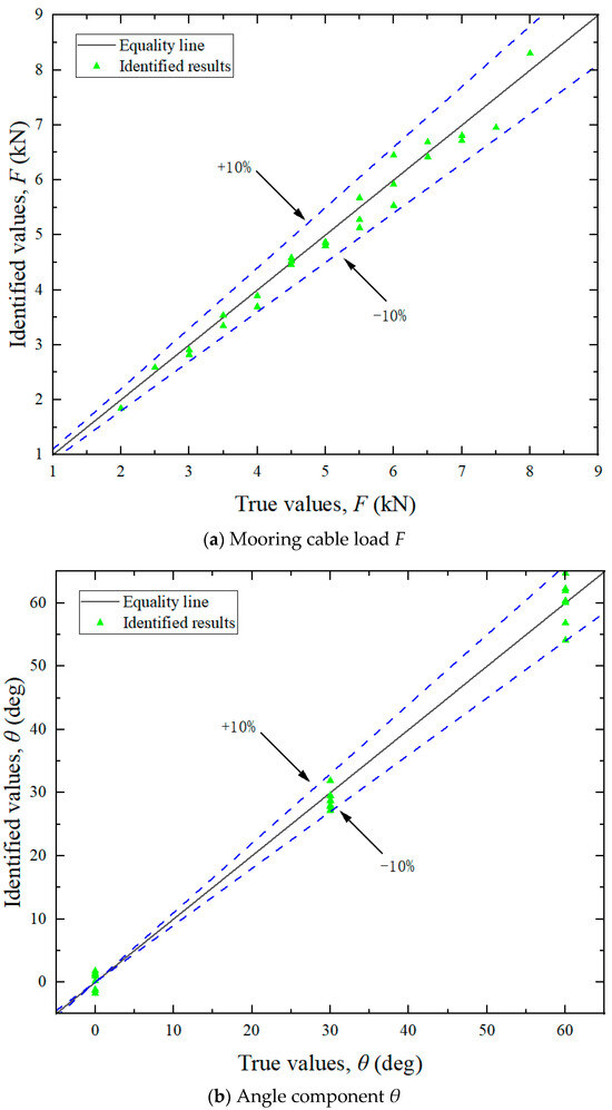 (3) Identification of mooring cable load. Although the maximum errors in the identification of individual load components ranged from 10% to 20%, the error in the identified mooring cable load (F) did not exceed 5%. This can be attributed to the fact that the cable tension is a result value derived from multiple components (see Equation (18)), and the maximum errors of each component did not occur at the same time.