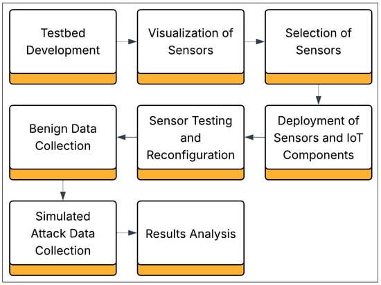 Block diagram showing the sequence of testbed development including selection and deployment of sensors, collections of benign and attack data, and analysis of results.