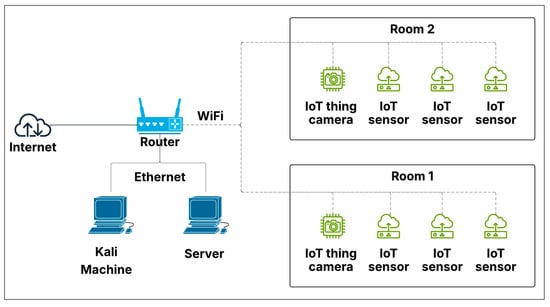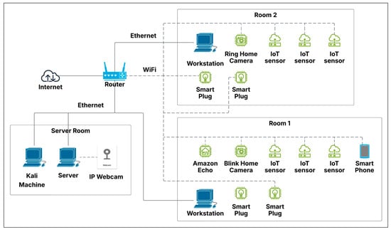 In summary, the project’s technical foundation integrates a diverse range of software and hardware components, each selected for their specific functionalities and relevance to IoT security. The software tools, including Kali Linux and Ubuntu (24.10), provide robust platforms for penetration testing, network analysis, and user-friendly operation. Meanwhile, the hardware components, such as webcams, smart speakers (Amazon Echo, Amazon, Seattle, WA, USA), sensors, and development boards enable the creation of a realistic and versatile IoT environment. Together, these elements establish a comprehensive framework that supports advanced research and practical applications in IoT security, fostering innovation and resilience in interconnected systems.