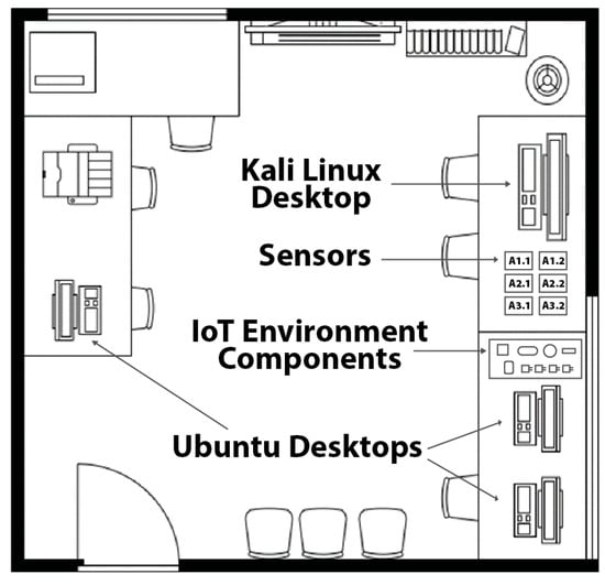 Our initial testbed comprised a three-room configuration designed to replicate a compact office environment, as illustrated in Figure 2. The third room contained the central server, which managed sensor communications, alongside a Kali Linux (2024.1) machine designated as the compromised device for simulated attack scenarios. While preliminary tests yielded favorable results, the lack of network diversity led to anomalously high accuracy rates for all intrusion detection algorithms. Consequently, we restructured the entire setup to introduce greater complexity, further challenging the algorithms and connecting the network to the Internet. This updated testbed retained the three-room structure but now included additional devices in each room, such as smart wall plugs, security cameras, workstation computers, an Amazon Echo, and smartphones, as depicted in Figure 3. Figure 4 depicts the actual setup of one of the rooms that was used for this study.
