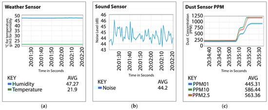 These charts depict (a) Humidity (g/m3) and temperature (°C) readings from sensors. (b) Noise (dB) level readings from sensors, and (c) Oxygen, CO2, and Particulate Matter (PPM) level readings from sensors.