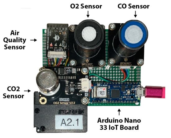 Photo of the A2.1 sensor which collects air quality, O2, CO, and CO2 levels using an Arduino 33 IoT Board. The A2.2 sensor (not pictured) is a duplication of the A2.1 sensor.