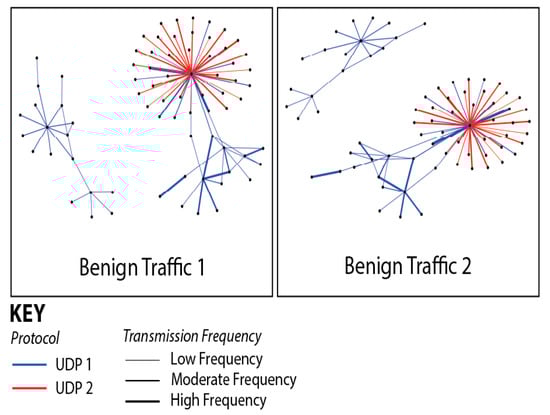 Composition of network tragic data. Colors indicate different protocols and line thickness represents transmission frequency between sensors.
