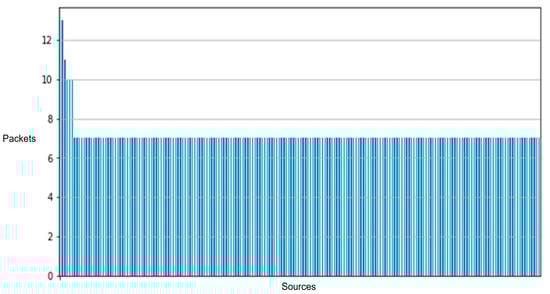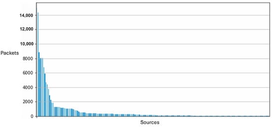 Network packet distribution across devices (i.e., packet sources) for the initial setup of the testbed. It shows that the vast majority packets were from a small number of sources.
