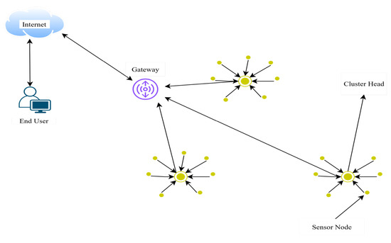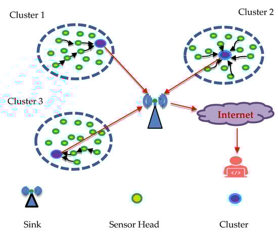 8]. The utilization of data aggregation techniques serves the purpose of enhancing the network’s lifetime. The aggregated data, once consolidated, are forwarded to the base station (BS). The BS is normally powered up by an electrical grid, and it has more computational capabilities. The radio transmission rate can be reduced while simultaneously enhancing the network’s lifespan by using this clustering approach. It achieved this by dynamic adjustment of the sensor lifespan with respect to low latency, low energy consumption, reliability, etc. [