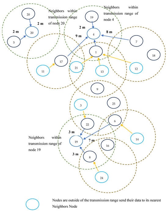 Figure 2, the cluster head of the first cluster is located closest to the sink node. In the second group, the position of the cluster head is located away from the sink node compared to the location of their sensor node. In the third cluster, the selection of the cluster head has been executed at a considerable distance from the sink node. The cluster head is selected far away from the sink node. In the above three clusters, the energy consumption of the first cluster may be high due to the data transmission performed through the neighbor node to the sink node, and the neighbor node to the head of the cluster may incur some unwanted energy waste. In the second cluster, the data transmission by the sensor node is directly to their cluster head, which is good, but the energy consumption may be high due to the cluster head being located away from the sink node compared to their other cluster nodes. In the third cluster, the energy consumption of the cluster may be high due to the substantial physical distance between the head of the cluster and the sink node.