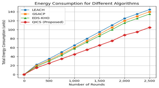 Figure 7. As the number of cluster heads increases from 5 to 15, the average energy usage declines from 0.45 J to 0.38 J, illustrating how QICS effectively reduces intra-cluster communication distances. This efficiency stems from the protocol’s use of Grover-inspired quantum search, which selects cluster heads based on residual energy and spatial proximity, rather than random assignment as in traditional schemes like LEACH.