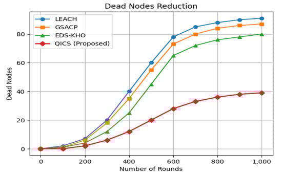 Figure 5, the analysis reveals a significant reduction in the number of dead nodes. Specifically, QICS demonstrates impressive results, reducing the dead node count by 58.5% compared to LEACH, 48.23% compared to GSACP, and 23.8% compared to ESD-KHO. The results confirm that QICS significantly improves network lifetime while reducing resource wastage in WSNs.