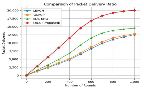 Figure 6, the delivery of the data packet from the CH to the BS is depicted following each round of execution. The proposed QICS algorithm exhibits a substantial enhancement in packet delivery ratio. Specifically, QICS achieves a remarkable 35.34% increase in packet delivery compared to LEACH, surpassing GSACP by 29.33% and EDS-KHO by 24.8%. These findings underscore the effectiveness of QICS in improving the reliability of data packet delivery to the base station while maintaining efficiency in wireless sensor networks.