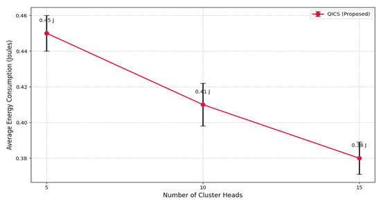 For instance, the energy consumption with 10 cluster heads was 0.41 J (±0.012 J), indicating low variability across runs and strong resilience of the QICS algorithm against environmental fluctuations.
