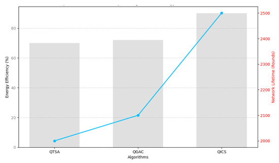 Figure 8 compares three quantum-inspired clustering algorithms—QTSA, QGAC, and QICS—using a dual-axis representation. QICS demonstrates a clear advantage, achieving approximately 25–30% higher energy efficiency and an extended lifetime of up to 20% compared to QTSA and QGAC. This improvement results from QICS’s integration of Grover’s amplitude amplification, which reduces computational complexity from