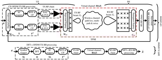 Block diagram of the communication system model for CP-OFDM and DFT-s-OFDM transmission. The diagram at the top side represents the transmitter (i.e., UE) and receiver (i.e., BS) for CP-OFDM with two ports. The bottom side diagram represents the case of the DFT-s-OFDM transmission. The transmit RF chain has the digital-to-analog converter (DAC), frequency up-converter (FUC), and PA. The virtual channel blocks include the effect of transmit and receive RF beams and multi-path propagation. The PAs are represented as a black triangle.