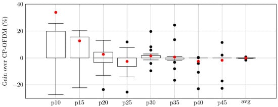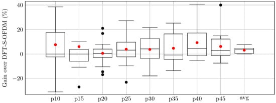 The relative throughput gains drawn as boxplots for the reward factors of the proposed AI-DPWS framework over CP-OFDM and DFT-s-OFDM are presented in Figure 2 and Figure 3, respectively. The red dots in each boxplot correspond to the average value, matching the values from Table 5.