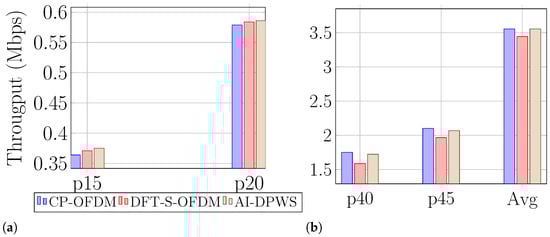 Finally, to better visualize the impact of AI-DPWS across all UEs in the evaluation, Figure 4a,b illustrate the achieved throughput of both fixed waveforms and AI-DPWS for different percentiles. As expected, for the lower percentiles, i.e., the cell-edge UEs, DFT-S-OFDM outperforms CP-OFDM. However, AI-DPWS outperforms both waveforms by taking into account the conditions of the channel and switching the waveforms accordingly. For percentiles closer to the median, CP-OFDM outperforms DFT-S-OFDM and in this case, AI-DPWS can only match the performance of the best fixed waveform scheme. It is worth noting that the silence periods caused by waveform switchings resulted in an average loss of throughput across the evaluation episodes. This corresponds with a worst-case of 19 ms reconfiguration delay for and type 2 UE category.