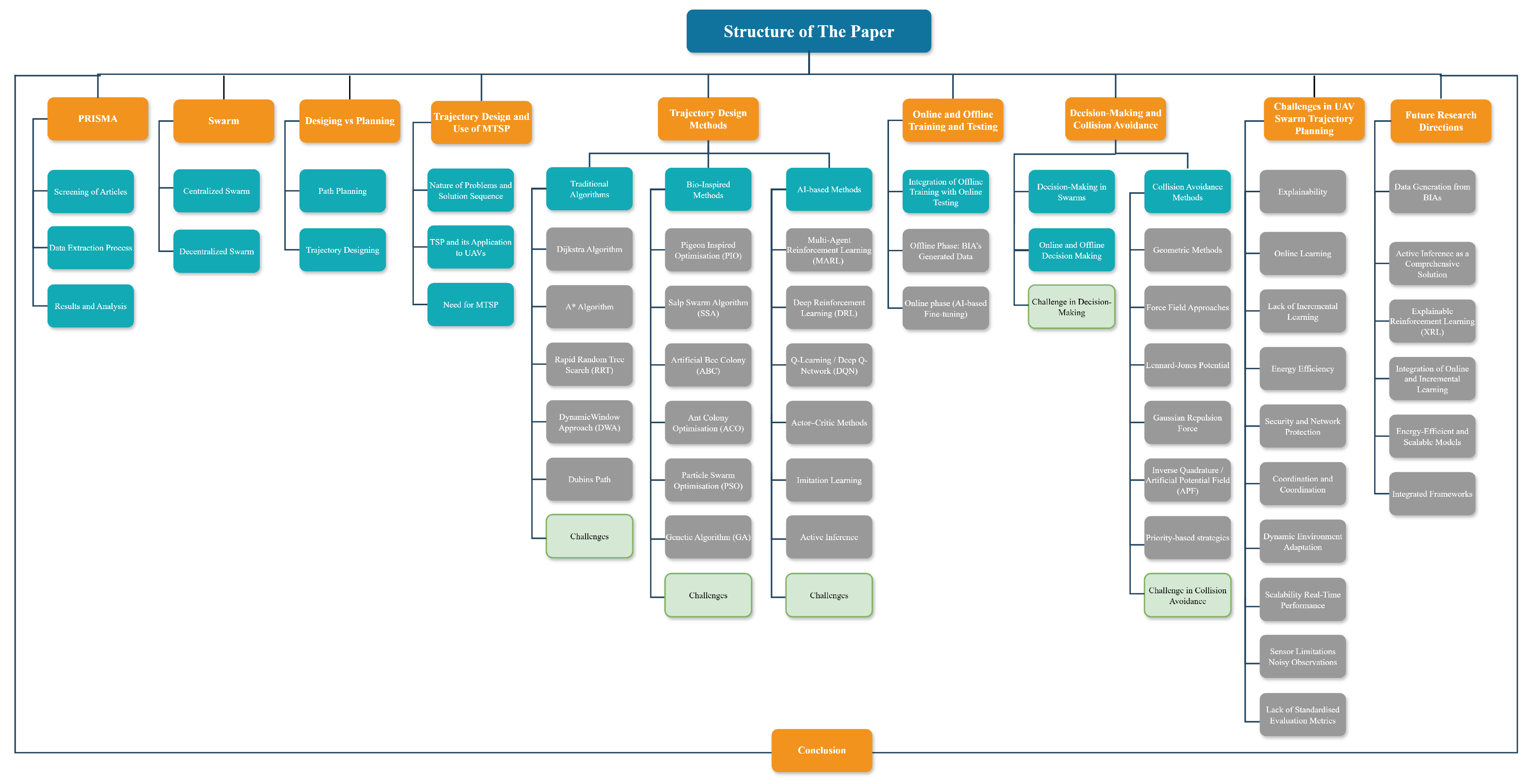 Figure 1 and is organised as follows: First, centralised and decentralised swarm approaches are discussed, followed by the distinction between trajectory design and path planning. Next, the MTSP problem and its application to UAV swarms are described. TA, BIAs, and modern AI-based strategies are then presented. Subsequently, aspects of online and offline training/testing, decision making, and collision avoidance are reviewed. Ultimately, the paper highlights the primary challenges and potential future directions of UAV swarms.