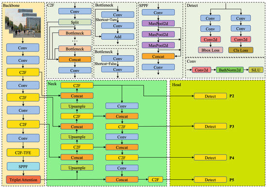 Architecture of proposed TFP-YOLO. The backbone network integrates a series of Conv and C2F modules to extract initial features, enhanced by a Triplet Attention mechanism. The neck module employs C2F and SPPF structures, incorporating Bottleneck and Concat operations to fuse multi-scale features, with upsampling and shortcut connections for improved information flow. The detection head utilizes multiple detect layers (P2–P5) to predict bounding boxes and class probabilities, optimized by Bbox Loss and Cls Loss.