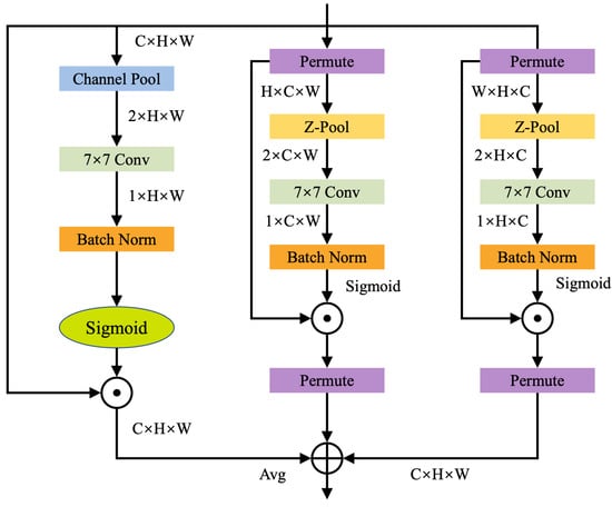 To improve detection accuracy for challenging targets such as crosswalks, which often exhibit unclear or fragmented edge features, the Triplet Attention mechanism is embedded at the end of the backbone network. This attention module enhances the network’s sensitivity to fine-grained spatial patterns, particularly in cases where edge information is weak. Triplet Attention is a three-branch module that receives an input tensor and outputs a feature tensor of the same shape. By applying directional transformations across its branches, the module allows edge features—such as those of crosswalk lines—to be captured from multiple orientations, thereby improving the network’s robustness in such detection tasks. The structural diagram of the Triplet Attention mechanism is shown in Figure 3.