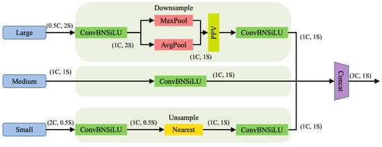 The feature map sizes and resolutions of each layer in the backbone network vary. Traditional fusion mechanisms, such as the standard FPN, typically only upsample small-sized feature maps and then fuse them with the features of the previous layer, often neglecting the rich detailed information contained in large-sized feature maps. In contrast, the proposed TFE module explicitly splits and processes feature maps from three different scales (large, medium, and small). Specifically, it incorporates large-scale feature maps and performs downsampling on them, while upsampling the small-scale feature maps. This process unifies their spatial dimensions to match the medium-scale feature map. By doing so, the TFE module effectively integrates both high-resolution details from shallow layers and high-level semantic information from deep layers, thereby significantly enhancing the extraction of feature information for small targets such as traffic lights. The structure of the TFE module is shown in Figure 5.