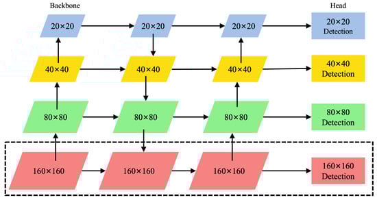 To improve the detection ability of small targets, this paper adds a  detection head to the P2 layer. As shown in Figure 6, the model introduces an upsampling operation based on the  feature map, expands it to , and fuses it with the corresponding scale features in the backbone, while adding a downsampling path to match the structure. Finally, four detection heads are constructed to jointly complete multi-scale target detection, which significantly enhances the model’s recognition ability for small targets. The specific detection scales are shown in Table 1.