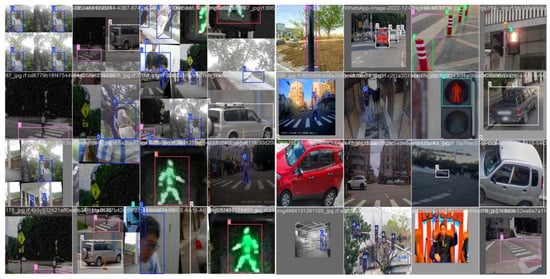 The custom dataset was collected by a camera on sidewalks in Beijing. After recording videos, frames were extracted using a Python script, with an image resolution of 640 × 640, covering various weather conditions such as sunny, rainy, and snowy days. The dataset includes eight types of typical obstacles and traffic signs, including pedestrians, cars, bicycles, crosswalks, traffic lights, poles, and traffic cones. The data is divided into a training set (8929 images), a validation set (1078 images), and a test set in a 0.8:0.1:0.1 ratio, with the latter two sets being mutually independent. Some samples and annotations are shown in Figure 8.