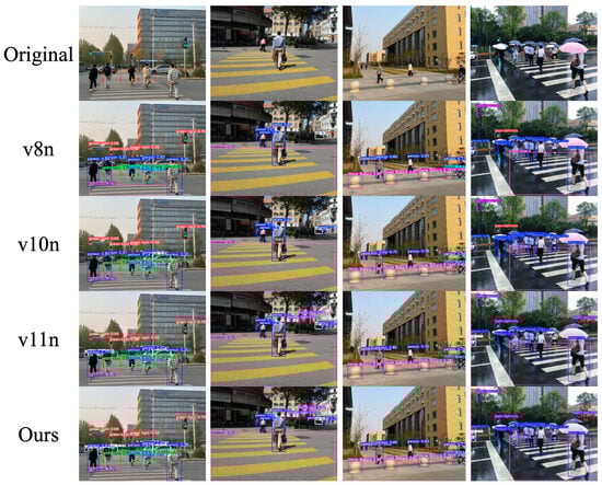 The improved algorithm was compared with YOLOv8n, YOLOv10n, and YOLOv11n—top performers in average accuracy—to evaluate detection on typical obstacles for visually impaired users, including crosswalks and traffic signs under various scenarios and weather conditions. Results are shown in Figure 9.