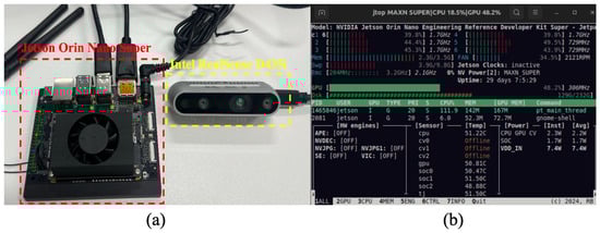 Implementation of the obstacle detection system on NVIDIA Jetson platform: (a) Jetson Orin Nano Super developer kit and Intel RealSense D435i depth camera; (b) real-time system performance monitoring.