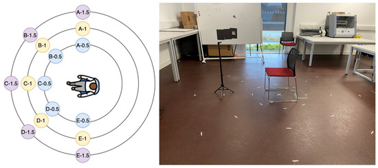 To account for potential variability in signal reception, five participants (three male and two female) were involved in the study. Although the participants’ height and weight were recorded for comparative reference in the event of discrepancies, the radar was consistently mounted at a height of 1 m to align with the upper thoracic region. Each subject was seated in a chair with the radar directly facing the chest. Data collection was carried out at three distances—0.5 m, 1 m, and 1.5 m—for each designated position (as illustrated in